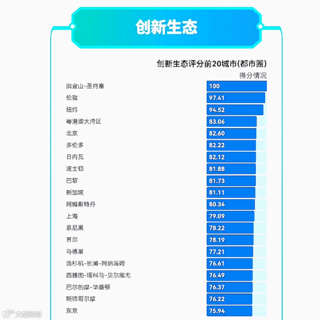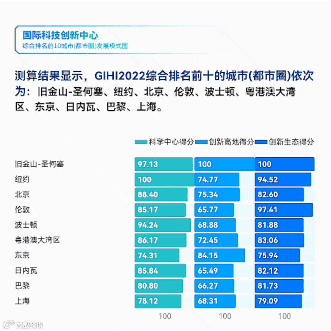 GIHI2022显示,旧金山—圣何塞、纽约、北京、伦敦、波士顿、粤港澳大湾区、东京、日内瓦、巴黎、上海在国际科技创新中心综合排名中分列前十强,北京首次跻身全球前三位。