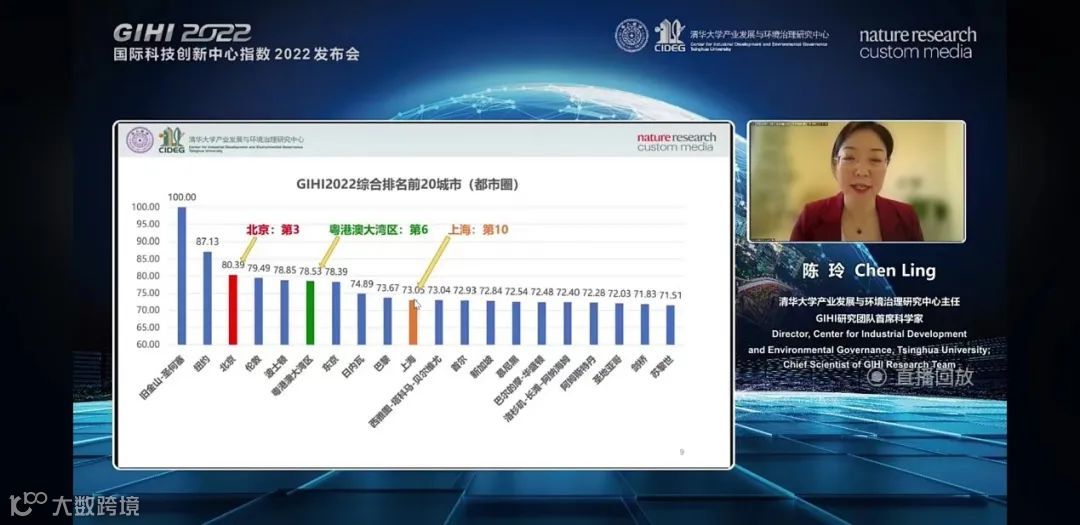 12月19日,施普林格·自然集团、清华大学产业发展与环境治理研究中心面向全球发布《国际科技创新中心指数2022》(Global Innovation Hubs Index,GIHI2022)。指数显示,北京首次超越伦敦,在全球国际科技创新中心中位列第三位。粤港澳大湾区、上海均进入全球前十强,分别位居全球第六、第十位。