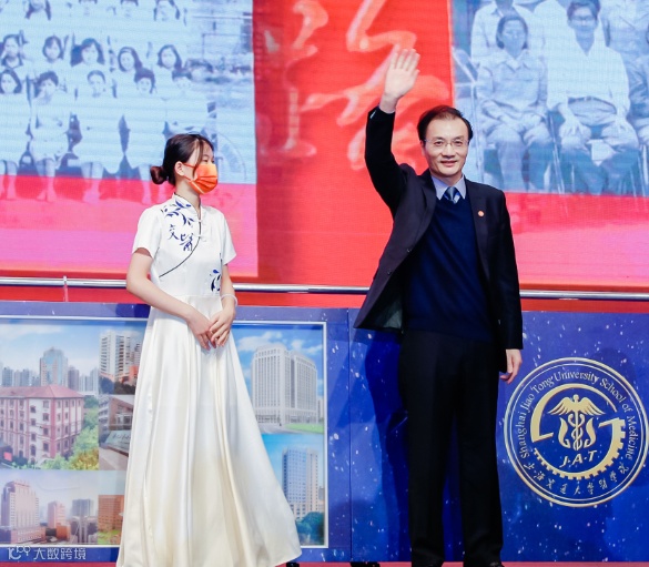 现场,交医杰出校友代表曹可凡、原上海第二医科大学副校长钱关祥、附属仁济医院院长夏强、附属瑞金医院副院长陈尔真同师生医务员工代表以一首《交医赋》献礼70周年院庆,追忆医学院百年历史,展望未来发展。