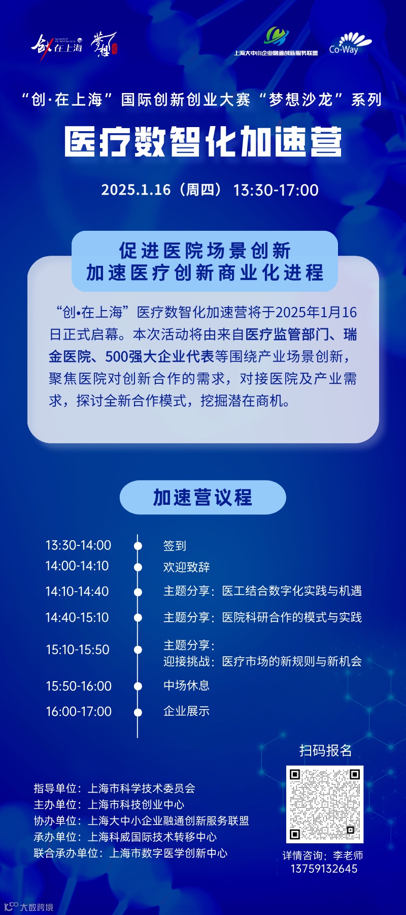在上海市科学技术委员会指导下,由上海市科技创业中心主办、上海科威国际技术转移中心承办的“创·在上海”国际创新创业大赛“梦想沙龙”系列之“医疗数智化加速营”将于1月16日正式启幕。本次活动将由来自医疗监管部门、瑞金医院、500强大企业代表围绕产业场景创新,聚焦医院对创新合作的需求,对接医院及产业需求,探讨全新合作模式,挖掘潜在合作商机。诚邀医疗数智化领域相关企业莅临。名额有限,报名从速,谢绝空降!