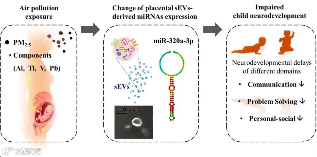 复旦大学公共卫生学院张蕴晖教授团队近日在Science of the Total Environment杂志在线发表了题为“Prenatal fine particulate matter exposure associated with placental small extracellular vesicle derived microRNA and child neurodevelopmental delays”的论文,着重探讨了产前PM2.5及组分暴露对儿童神经发育的影响,并探究了胎盘小细胞外囊泡(small extracellular vesicles,sEVs)来源的miRNA在其中的潜在作用。基于PM2.5个体监测,本研究较为全面地评估了产前PM2.5及化学组分对婴幼儿神经发育的影响,为识别和鉴定PM2.5神经发育毒性效应的关键组分提供了数据支持。此外,本研究首次从胎盘sEVs来源miRNA角度,探究了产前PM2.5及其组分暴露影响子代神经发育的生物机制,为PM2.5的神经发育毒性机制研究提供了新的方向和思路。