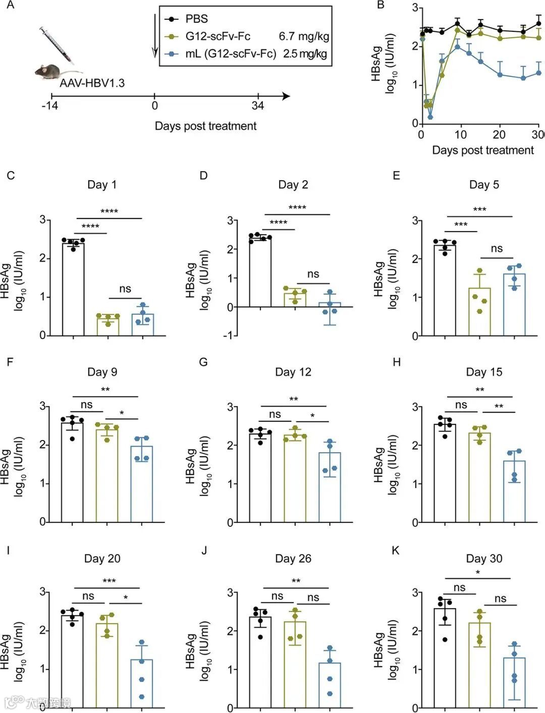 近日,上海市重大传染病和生物安全研究院双聘PI、复旦大学基础医学院的应天雷,吴艳玲团队和上海市重大传染病和生物安全研究院双聘PI、复旦大学生命科学学院林金钟团队合作,发现mRNA-LNPs首次被用于表达抗-HBsAg抗体(G12-scFv,G12-scFv-fc,G12-IgG)。在具有持续HBsAg表达的腺相关病毒(AAV)/HBV小鼠模型里,G12-scFv-Fc-和G12-IgG-编码的mRNA-LNPs对血清HBsAg清除有持续的影响。这些发现可能为功能性治疗乙肝病毒提供一种新的联合治疗方案。例如,这种策略可以为体内的抗体提供一种“三明治”疗法,进一步增强治疗的免疫性能。总的来说,mRNA疗法在感染性疾病的治疗中很有前景,因为它们发展迅速,经济价值高,而且简单易行。该研究成果在杂志 mBio 上发表,题为“A Single Dose of Anti-HBsAg Antibody-Encoding mRNA-LNPs Suppressed HBsAg Expression: a Potential Cure of Chronic Hepatitis B Virus Infection”。