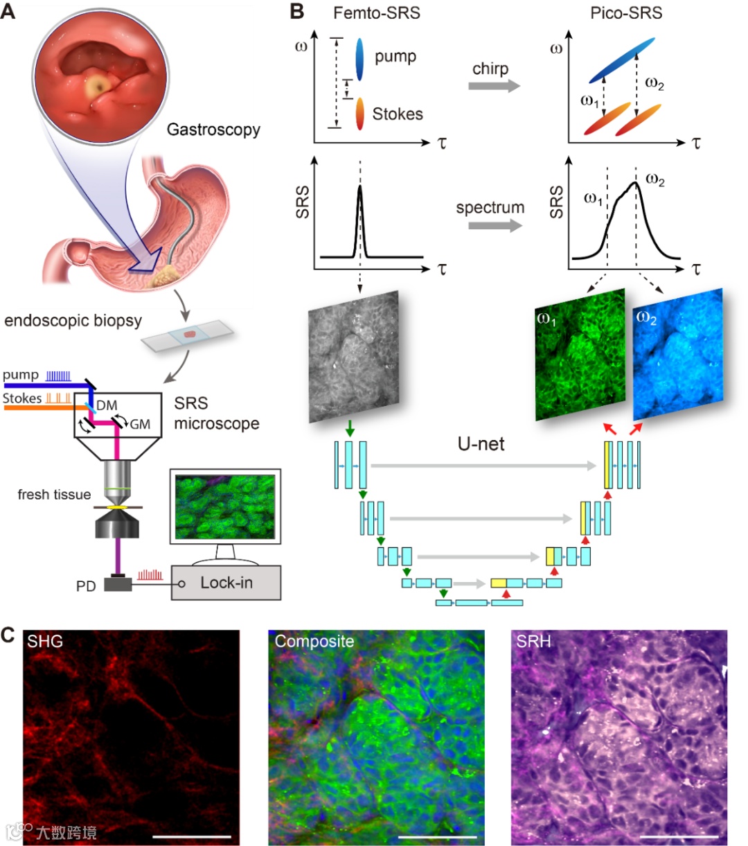 近日,复旦大学附属中山医院内镜中心周平红教授课题组与复旦大学物理系季敏标教授团队合作开发了基于飞秒受激拉曼技术的快速病理成像技术,成功实现了对内镜活检组织的精准实时智能诊断。相关研究成果以《深度学习的单帧飞秒受激拉曼病理显微镜实现胃内镜活检的即时诊断》(“Instant diagnosis of gastroscopic biopsy via deep-learned single-shot femtosecond stimulated Raman histology”)为题在线发表于《自然··通讯》[Nature Communications, 13, 4050 (2022)]。此项研究为简化复杂的受激拉曼成像系统提供了新的解决思路,突破了受激拉曼病理显微镜的速度极限,拓展了光学成像技术的生物医学应用范围,为内镜活检标本的快速诊断提供了全新的方法,也为受激拉曼病理显微镜的临床转化提供新的技术基础。