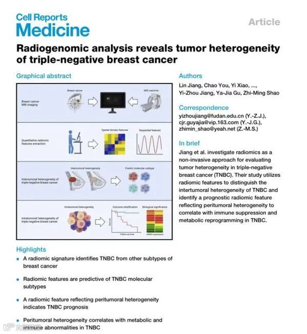 “仅通过乳腺癌患者增强磁共振影像资料,无需穿刺,便可精准预测三阴性乳腺癌的分型分类;基于数字病理图像构建的神经网络模型,通过一张小小的病理HE染色切片,数小时便可明确三阴性乳腺癌分子分型和关键治疗靶点……”近日,复旦大学附属肿瘤医院精准肿瘤中心主任、乳腺外科主任邵志敏教授团队,联合医院放射诊断科主任顾雅佳教授团队、病理科副主任杨文涛教授团队,并与复旦大学类脑智能科学与技术研究院王鹤研究员团队、南京信息工程大学徐军教授团队“医工携手”,通过“院内多学科团队联合+跨区域医工交叉协作”的方式,为三阴性乳腺癌的临床诊断研制出了“复旦肿瘤”智能方案。相关研究成果在美国《细胞》杂志旗下期刊《细胞报告·医学》、国家自然科学基金委旗下期刊《基础研究》在线发表。