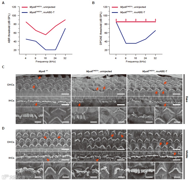 7月21日,国际顶尖期刊《科学转化医学》(Science Translational Medicine)在线发表了复旦大学附属眼耳鼻喉科医院舒易来主任、李华伟教授和中科院脑智卓越中心杨辉研究员合作的研究论文“Rescue of autosomal dominant hearing loss by in vivo delivery of mini dCas13X-derived RNA base editor”(基于迷你型dCas13X开发的RNA碱基编辑器治疗常显性遗传性耳聋)。该研究基于新型的RNA编辑工具dCas13X,研发了精准治疗显性遗传性耳聋的前沿技术——针对常见显性遗传性耳聋基因肌球蛋白(MYO6)的RNA单碱基编辑器(mxABE),成功改善了动物模型的听力。这是国际上首个基于RNA单碱基编辑技术成功精准治疗显性遗传性耳聋的研究,为耳聋的精准治疗以及安全的临床转化提供了有力的科学证据。