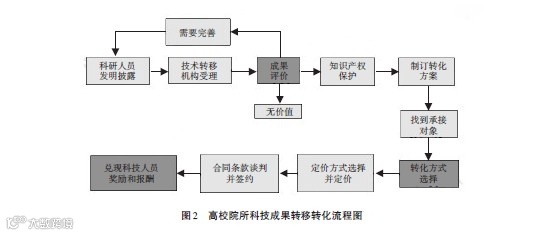 如图2所示,科研人员发明披露及技术转移机构对科研人员披露的发明创造进行评价,是研发与转化的衔接点。成果评价既能够促进科研人员提高技术研发水平,又可以提高知识产权保护水平。接下来的制定转化方案、寻找承接对象、选择转化方式、成果定价、谈判签约等流程,须在实操中不断优化,并由高校院所对科技成果转化制度作出规定。这个流程能否有效运行,取决于高校院所的技术转移体系(包括技术转移机构和技术转移人才队伍等)的健全程度及其运行效率。