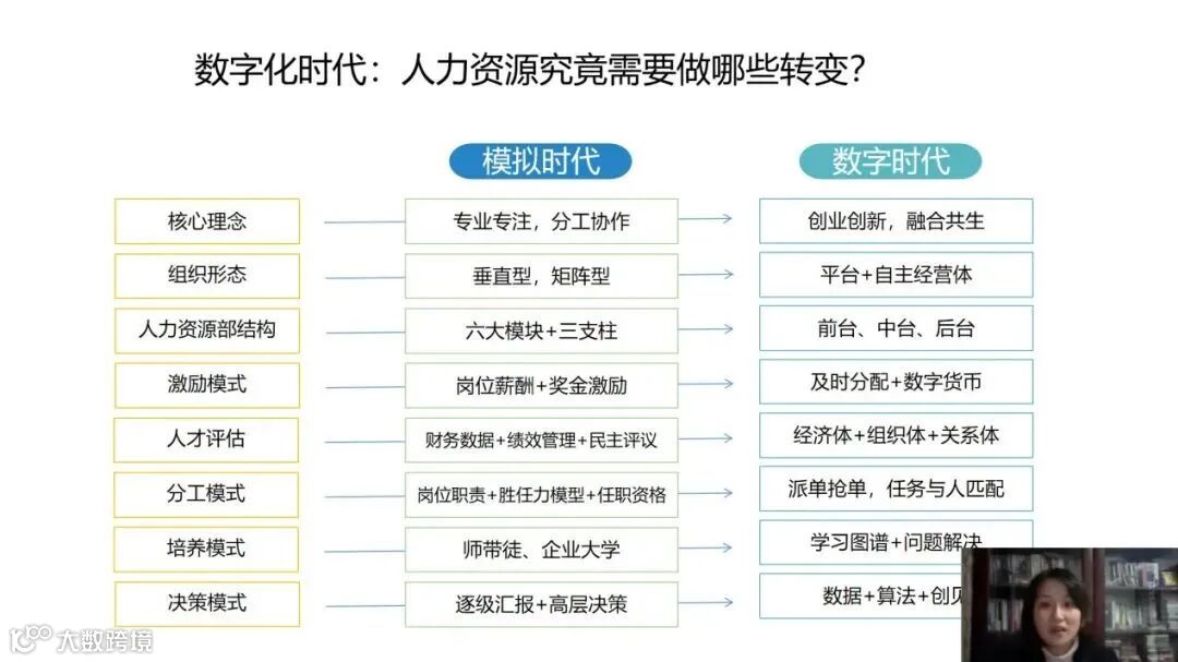 最后,面向开头提到的人力资源的五大特殊性,大任智库的五大方法都为之找到数字化的应对成效。数字化时代,人力资源究竟需要哪些转变呢?何老师老师也创新性地给出了答案。