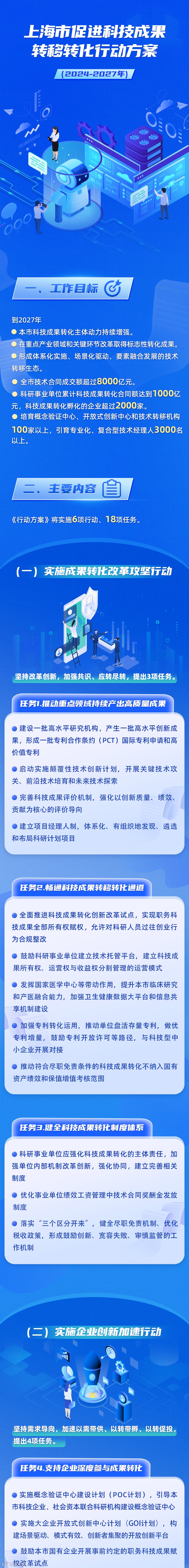 为贯彻落实党的二十届三中全会和全国科技大会精神,坚持树立“科技成果只有转化才能真正实现创新价值、不转化是最大损失”的理念,力求进一步提高成果转化效率,近日,市政府办公厅印发《上海市促进科技成果转移转化行动方案(2024-2027年)》。