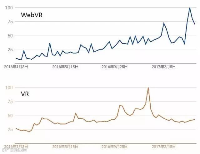 2016年被称为“VR元年”,VR行业在被炒热又唱衰的过程中逐渐进入稳步发展的阶段。在各细分领域寻求VR+解决方案、行业巨头布局各自平台时,WebVR也逐渐进入人们视野。Google Trends显示,相比于VR的过山车,WebVR的搜索一直在波动上升。