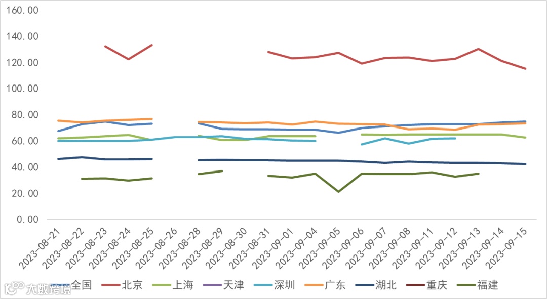 碳配额价格:9月以来,全国碳市场配额(CEA)价格维持上涨趋势,9月15日收盘价格74.76元/吨,较上月末涨5.97元/吨。地方碳市场碳配额价格多数呈下跌状态,其中北京碳市场9月15日收盘价为115.13元/吨,较上月末下跌粤10.05%;天津、重庆市场交易天数较少。