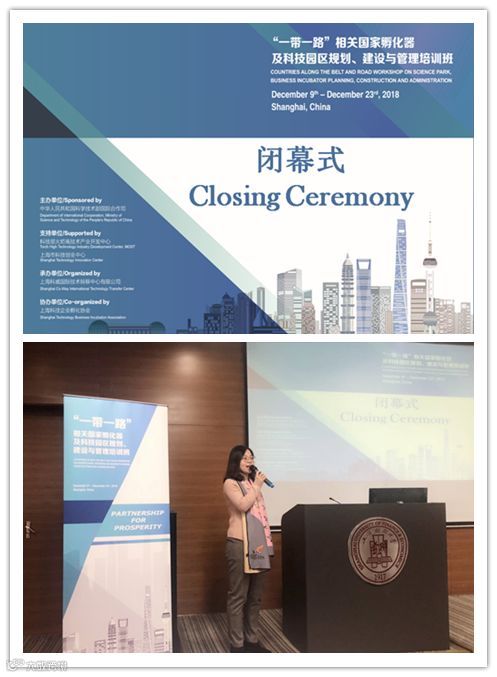 闭幕式上,科技部火炬高技术产业开发中心国际合作处磨坦处长和上海市科技创业中心黄丽宏副主任分别致辞,并为学员颁发了结业证书。四位分别来自伊朗、捷克、波兰和马来西亚的学员作为学员代表发言,和大家分享了从为期两周的培训中所获得的感受和收获。