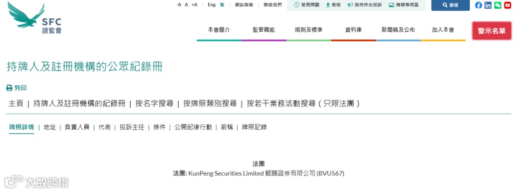 鲲鹏道合的核心团队在香港创立鲲鹏证券(香港),已成功获得香港证券及期货事务监察委员会(SFC)核准的第1(证券交易)、4(就证券提供意见)、9(提供资产管理)类受规管活动牌照。