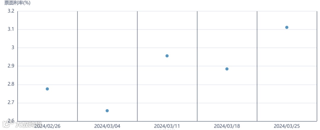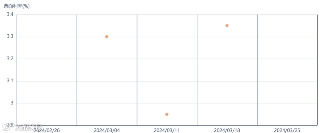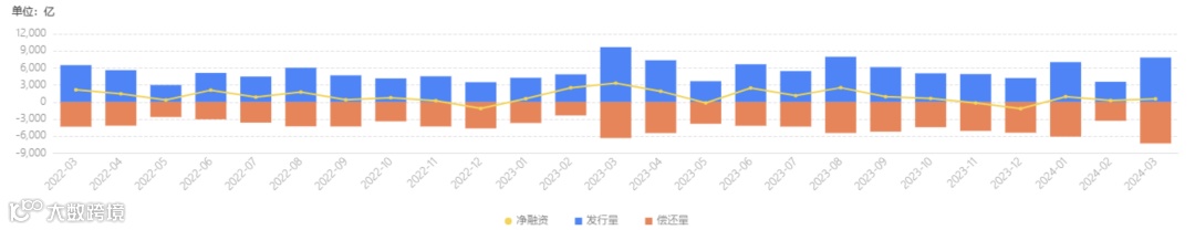 2024年3月份为春节后第一个假期,存续到期压力偏大,借新还旧发行新债明显放量,净融资也同时上升。当月共计发行7837.12亿元,偿还7279.13亿元,净融资557.99亿元。发行与偿还量较去年12月均有较大增长,并且从净偿还转变为净融资。