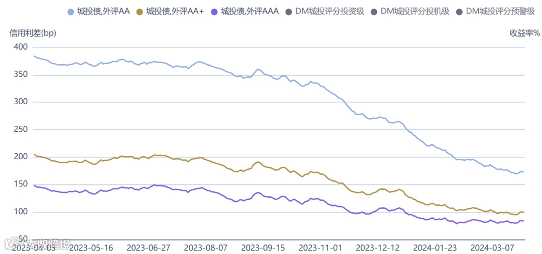 3月以来,城投债信用利差出现震荡,AAA级与AA+级债券利差走阔。具体来看,债项AAA级、AA+级城投债分别走阔5.97 BP,3.49 BP,23.04 BP。