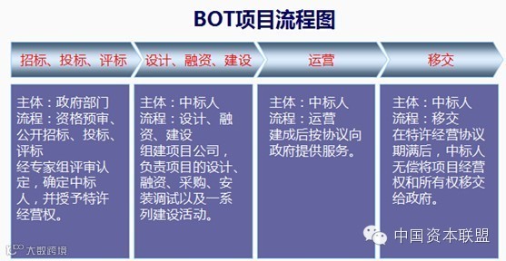 BOT是英文Build-Operate-Transfer的缩写,即“建设-经营-转让”。实质上是基础设施投资、建设和经营的一种方式,以ZF和私人机构之间达成协议为前提,由ZF向私人机构颁布特许,允许其在一定时期内筹集资金建设某一基础设施并管理和经营该设施及其相应的产品与服务。ZF对该机构提供的公共产品或服务的数量和价格可以有所限制,但保证私人资本具有获取利润的机会。整个过程中的风险由ZF和私人机构分担。当特许期限结束时,私人机构按约定将该设施移交给ZF部门,转由ZF指定部门经营和管理。