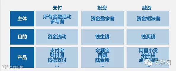 从用户需求的角度出发,互联网金融和传统金融其实没什么差,一样是为了满足用户的三大基本金融需求:支付、投资、融资。