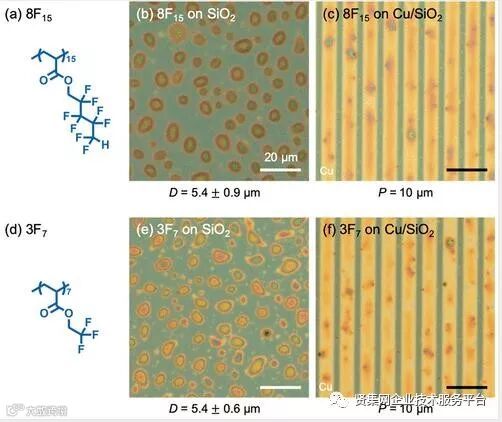 图1.(a)一步旋涂选择性沉积示意图。将半氟化聚合物旋涂到天然Cu / SiO 2基底上,选择性地涂覆Cu,而无需对表面进行预处理。(b)聚合物设计可促进均匀表面上的优先去湿,这转化为在异质图案上的选择性沉积。