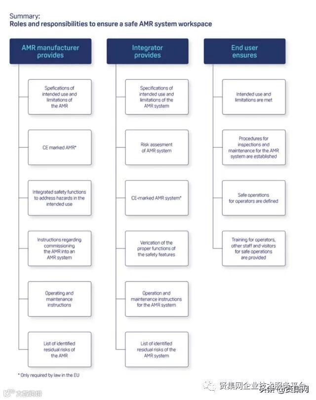 除了设计安全的机器人外,制造商还必须提供足够的文档,包括有关将AMR调试到移动机器人系统中的说明,有关AMR的操作和维护的操作说明以及已识别出的AMR残留风险的列表。最终,制造商有责任提供开箱即用的安全AMR和所有必需的文档。