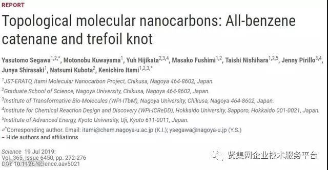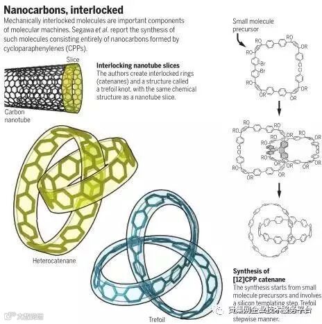 2019年7月,Segawa等人报道了全苯链构造的机械互锁纳米碳的合成。这些机械结合的纳米碳在碳纳米科学和分子机器研究之间架起了一座桥梁。该研究成果以题为“Topological molecular nanocarbons: All-benzene catenane and trefoil knot”的论文发表在国际顶级学术期刊Science上(见文后原文链接)。