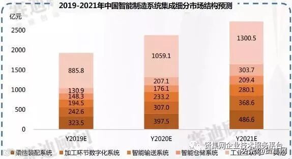 赛迪顾问预计预计到2021年,中国智能制造系统集成市场规模将达到2948.9亿元。集成细分市场,未来三年,工业互联网的快速发展将极大地带动工业大数据、工业云平台等技术在工业领域的深入应用,而这类智能制造系统集成市场将会迅速爆发。