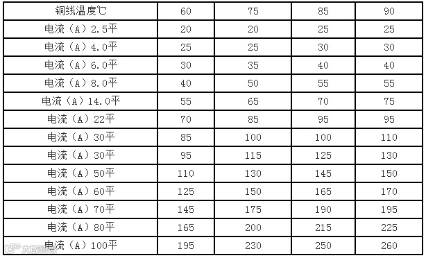 下面是铜线在不同温度下的线径和所能承受的最大电流表格。