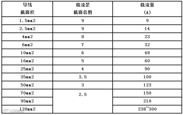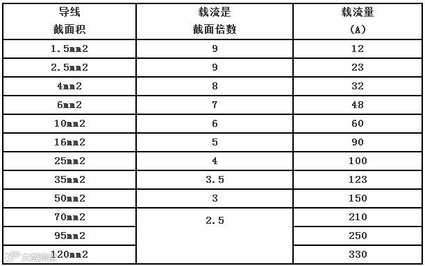 给你解释一下,就是10平方以下的铝线,平方毫米数乘以5就可以了,要是铜线呢,就升一个档,比如2.5平方的铜线,就按4平方计算.一百以上的都是截面积乘以2, 二十五平方以下的乘以4, 三十五平方以上的乘以3, 柒拾和95平方都乘以2.5,这么几句口诀应该很好记吧,