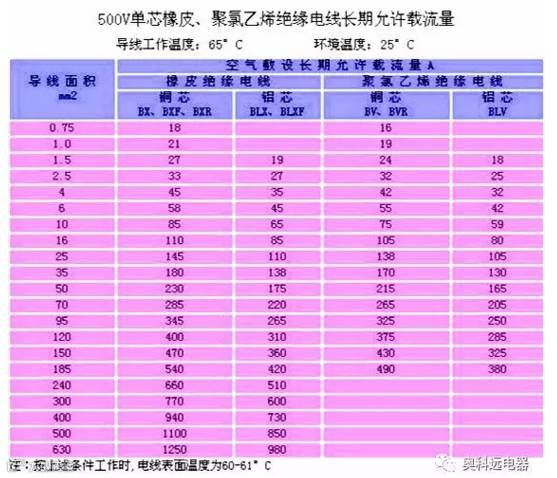 上述口诀是铝芯绝缘线、明敷在环境温度25℃的条件下而定的。若铝芯绝缘线明敷在环境温度长期高于25℃的地区,导线载流量可按上述口诀计算方法算出,然后再打九折即可;当使用的不是铝线而是铜芯绝缘线,它的载流量要比同规格铝线略大一些,可按上述口诀方法算出比铝线加大一个线号的载流量。如16mm’铜线的载流量, 可按25mm2铝线计算横截面积越大,电阻越小,相同电压下通过的电流越大。