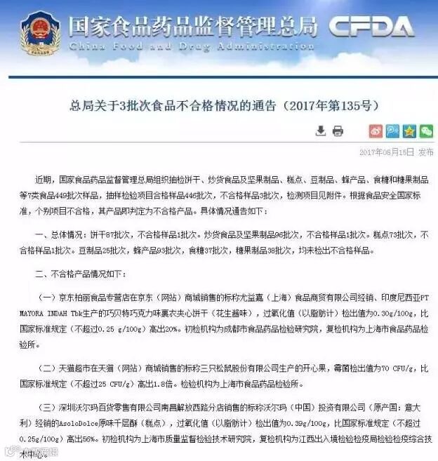 目前,国家食药监总局已就抽检不合格的食品通报相关省份依法予以查处,并要求地方主管部门责令进口商、生产企业查清产品流量、召回不合格产品,分析原因进行整改。同时,还要求地方主管部门责令网络食品交易平台对不合格产品及时下架。