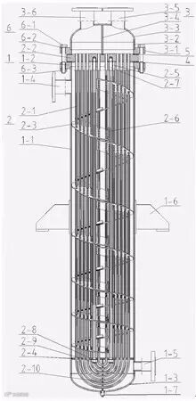 一种立式螺旋折流板U型管式冷凝器,包括壳体组件、管束组件、上封头组件等;其管束组件的螺旋折流板组的扇形折流板的下游边向上折弯形成挡液堰,位于管排之间;在扇形折流板的弧形边上设有上游疏液缺口和下游疏液缺口;扇形折流板的倾斜角从上到下分段减小;螺旋折流板组还可为双头螺旋或三头螺旋。扇形折流板不仅支撑管束,而且有助于将管束表面液膜刮干,并将凝结液引导到壳体内壁,沿壁面排放到底部,使在折流板下方的管子以干燥表面与蒸汽直接接触,提高凝结换热系数。本发明使得具有占地面积较小、抽管束方便、便于维修优点的立式管壳式冷凝器的换热系数得以提高。