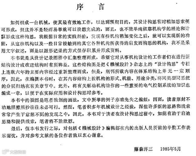 机械设计实用构思图册原书作者是日本人,藤森洋三,虽然我没听过但是这个图册确实实用,今分享给大家的是译本,我国机械工业出版社出版的。师夷长技以制夷,日本人在工业方面还是值得我们学习的,分享该图册给大家下载学习!