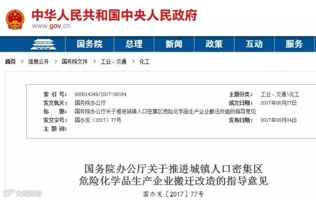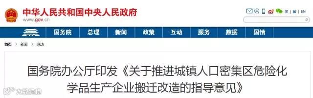 《意见》指出,实施城镇人口密集区危险化学品生产企业搬迁改造,是适应我国城镇化快速发展,降低城镇人口密集区安全和环境风险的重要手段,对解决危险化学品生产企业安全和卫生防护距离不达标问题、有效遏制危险化学品重特大事故、保障人民群众生命财产安全和促进石化化工产业转型升级等具有重要意义。