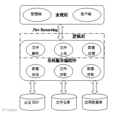 本系统采用三层客户机/服务器(C/S)架构。三层客户机/服务器体系结构通常指表现层,逻辑层和数据层。其中表现层,给用户提供一个可视化界面;逻辑层,是表现层和数据层的桥梁,它响应界面层的用户请求,执行任务并从数据层获取数据,然后将必要的数据传送给表现层;数据层,主要包括数据层定义、维护数据的完整性、安全性,它响应逻辑层的请求,访问数据。系统架构如图所示。