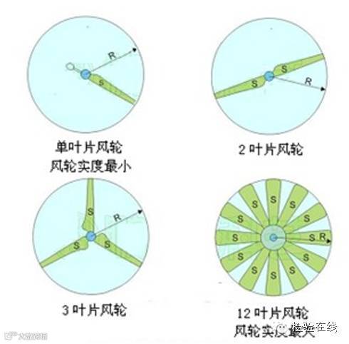 图:描述的是单叶片到多叶片的风轮实度,S为每个叶片对风向的投影面积, R为风轮半径,B为叶片个数,σ为实度比;它们的关系是---σ=BS/πR²。