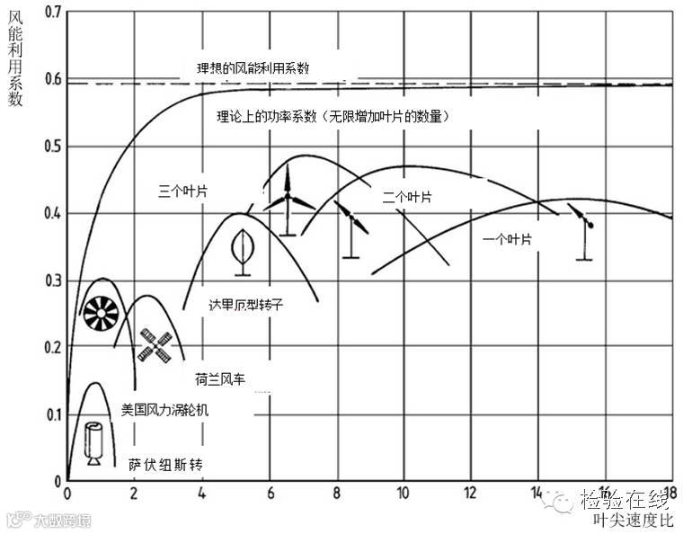 图:描述的是各种风机的风能利用系数的比较,根据动量理论,理想的风能利用系数是0.593,通上图可以看到,现代三叶风机的风能利用系数已经达到了最高水平,约为0.48~0.49,当然,经过对叶片形状的设计优化现在已经能够达到0.5甚至更高。