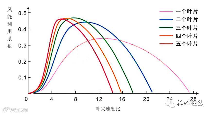 从上图看可以看出随着叶片数量的增加,风能利用的系数也在增加,但是在从3叶到4叶到5叶的增加的幅度相比于1叶到2叶到3叶的增加小的多的多,从成本角度讲,这是得不偿失的。