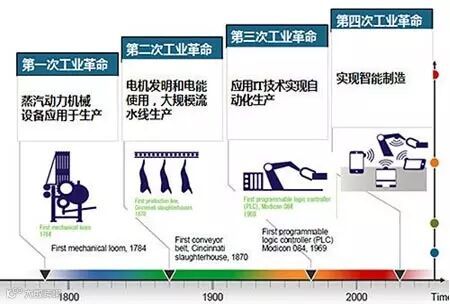 “中国制造2025”围绕创新驱动、智能转型和绿色发展,欢迎各国企业积极参与“中国制造2025”计划,有效提升中国制造业国际合作水平。最终实现中国制造业的升级方向“工业4.0”互联+制造业。下图为工业1.0、2.0、3.0、4.0发展历程。