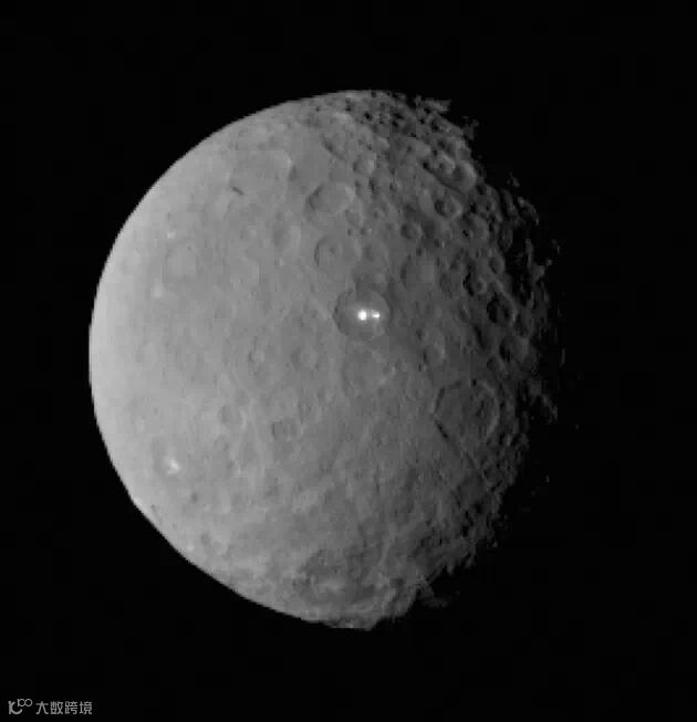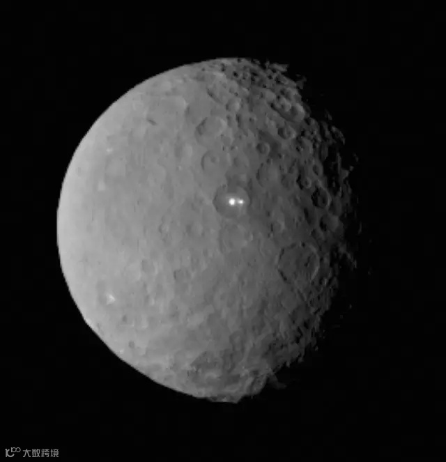 2 谷神星上的神秘亮斑或来自冰 NASA的“黎明”号探测器观察到了谷神星表面的一对明亮斑点,这可能与冰的地质活动有关。“黎明”号目前正围绕这颗矮行星运行,新发回来的照片显示,随着谷神星自转,斑点会在黎明达到最亮,在黄昏达到最暗,这可能暗示阳光改变了表面水的状态。这个发现在3月17日的月球与行星科学研讨会上首次公布。