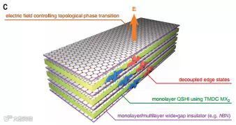 量子自旋霍尔效应(QSH)材料都有着能在拓扑上防止它们发生背向散射的边缘态。然而,QSH绝缘体中过窄的带隙限制了它们的应用。科学家使用第一性原理计算,预测了一类宽带隙的QSH绝缘体——它们是1T’结构的二维过渡金属二硫族化合物,即1T′-MX2,其中M代表钨或钼,X代表碲、硒或硫。结构上的扭曲导致这类化合物内部硫族元素的p能带与金属的d能带出现倒转,此外,自旋-轨道耦合打开了能隙,而这是可以通过垂直电场和张力进行调控的。科学家用1T′-MX2与二维介电层组成的范德瓦尔斯异质结构制成一种拓扑场效应管,可以用电场通过拓扑相转变来实现快速的开关,不用通过载流子耗尽来实现。