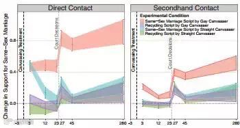 诸如同性婚姻等社会问题极易引发分歧,一次谈话能否改变人们的想法?一项随机安慰剂对照试验试图评估,不同性取向的调查员(同性恋22名,异性恋19名)是否能让受访者(共972人)支持同性婚姻并投出有效票数,以及这种态度改变是否能持续并扩展到受访者的社交网络中。结果表明,调查初期,同性恋和异性恋调查员都对受访者的态度产生了很大影响,但是,在随后3周、6周和9个月的随访中,只有与同性恋调查员谈话的实验组持续了这种效果。我们还发现了有力证据,证明这种态度转变会在同一居所内传播,但只有与同性恋调查员交谈后才产生了这样的效果。而且,与同性恋调查员接触还使人们对同性恋群体的支持率产生了更普遍的实质性变化。这些影响被后续的实验逐步证实,效果明显、持续性强,且影响面广。这说明人们与少数群体接触并讨论有关他们的问题后,会产生一连串的观念变化。