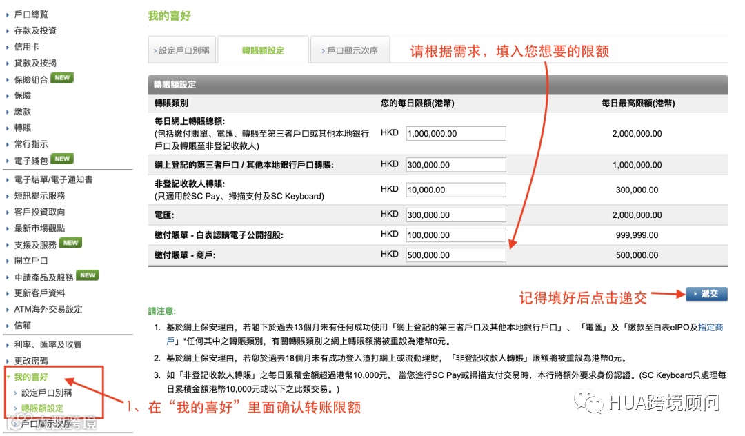 渣打银行通常根据账户等级有不同的限额,普通账户最大限额为:100万港元;premier customer 账户最大限额200万港元。