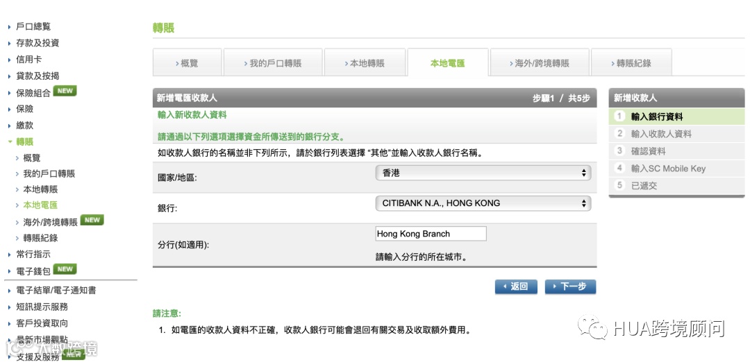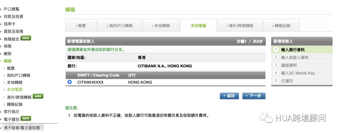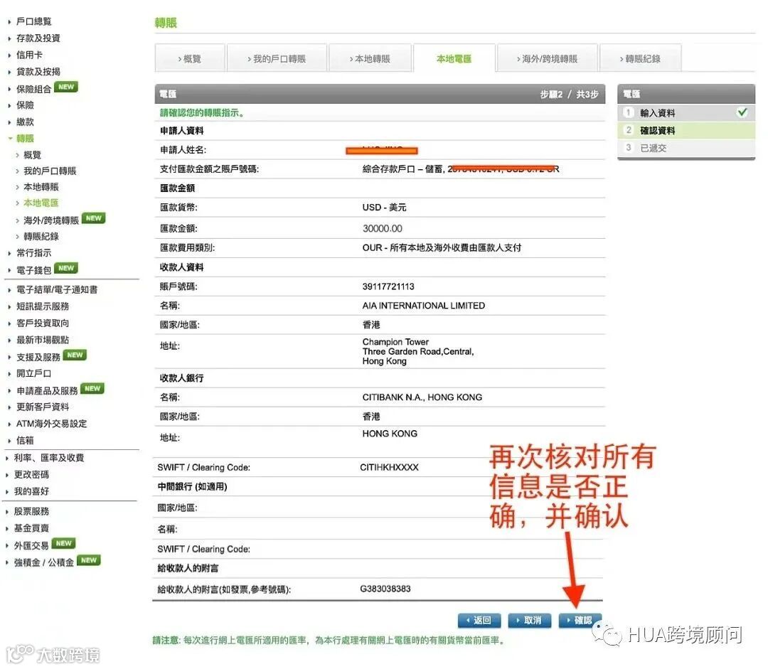 选择新增一个收款人,输入收款银行资料。录入完毕后点击下一步,进入确认界面: