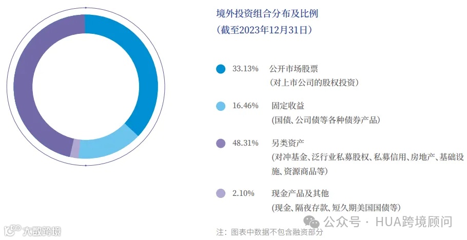 投资组合分布中,公开市场股票(对上市公司的股权投资)33.13%、固定收益(国债、公司债等各种债券产品)16.46%、另类资产(对冲基金、泛行业私募股权、私募信用、房地产、基础设施、资源商品等)48.31%、现金产品(现金、隔夜存款、短久期美国国债等)及其他2.10%。