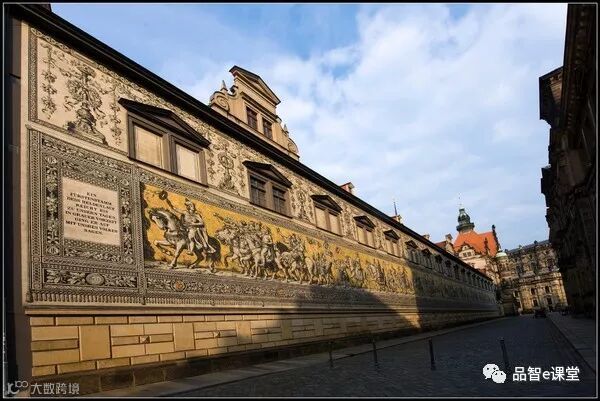 这是一幅101米长的世界最大的瓷器壁画——王侯队列图(Procession of the Princes)。在墙面上镶有迈森(Meissen)出产的陶瓷片,手工精细,共用了27000片瓷砖。