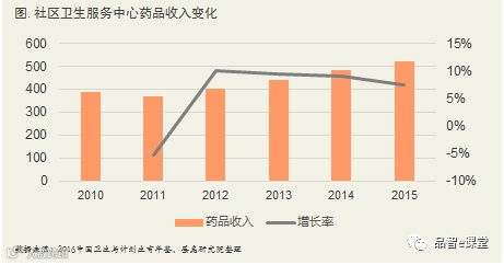 基层药品收入占比不断增长,药品收入不断增加。根据《2016年卫生与计划生育年鉴》,2011年至2015年社区卫生服务中心平均药品收入不断增加,2010年平均药品收入为388.1万元,2015年平均药品收入已达到519.8万元,年均增长率为6%。