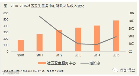 基层医疗机构平均财政补贴收入持续上升。2010年社区卫生服务中心的平均财政补贴收入为185.2万元,到2015年已增长至487.8万元。平均年增长率为21.3%。另外,财政补助占总收入的比重也不断上升,以社区卫生服务中心为例,财政补助占总收入的比重也从22.9%提升到36.5%,收入结构发生显著变化。