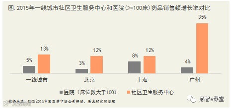 根据IMS Health《2016中国医药市场全景解读》,2015年中国社区药品销售额达到420亿人民币。其中一线城市社区卫生服务中心销售额增长率为13%,远高于医院渠道的药品销售额增长率。其中广州社区卫生服务中心销售额增长率高达35%,这主要是得益于广州推行的基层首诊制度,通过控制不同等级医疗机构的支付比例,大大增长了基层医疗机构的首诊比例。