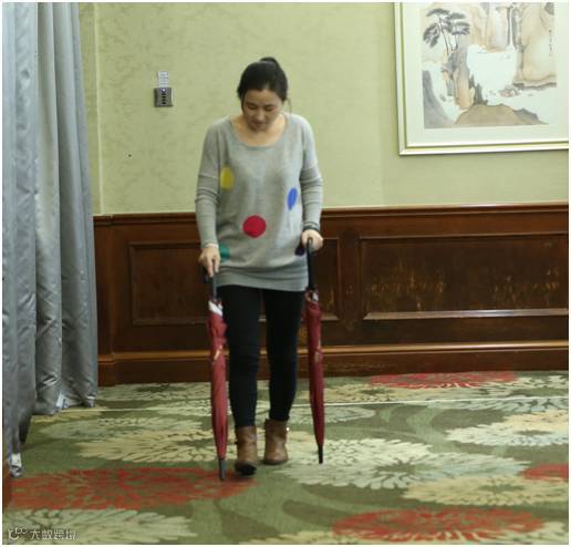 在进行康复评估时,托马斯•博赫丹斯基教授除了介绍非常专业的具体评估指数(Barthel巴氏指数、WOMAC骨关节炎指数等), 还介绍了实用和易操作的步态测试、平衡力测试等方法;为了让学员加深了解这些测试评估的方法,托马斯•博赫丹斯基教授让学员们现场演练步态测试,学员们二人一组分别按照正常状态进行4米和10米的步行并进行计时,随后扮成残疾人以雨伞作为拐杖再进行4米和10米的步行并计时。以这二组数据进行比较,并对照相应的参数,对病患做出恰当的评估。