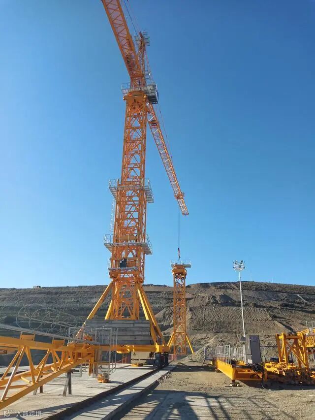 在这种极端条件下,中联重科携手承建商中国能建葛洲坝集团,为项目供应了多台锤头式塔机TC7052-25和D800-42投入使用。考虑到此项目气候环境较为复杂,且设备需要极高的抗风能力,中联重科研发团队针对该项目做了一系列特殊化设计,如采用片式标准节结构,节片间用经特殊处理过的销轴连接,标准节主弦杆拼方采用埋弧焊,大大提高了力学性能;腹杆采用方钢管结构,分散风力,优化了塔机的抗风性。