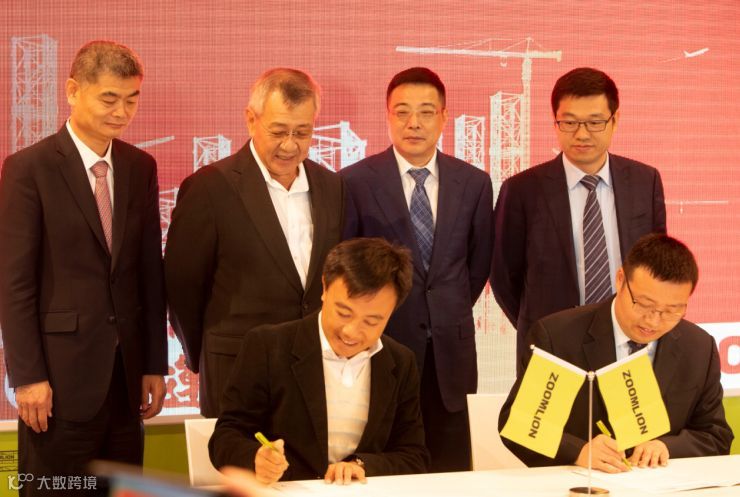 在中联重科副总裁熊焰明,中联重科助理总裁、建筑起重机械公司总经理唐少芳,新加坡长运集团主席Ang Kah Hong,机电商会副会长王贵清的见证下,中联重科海外公司总经理助理刘坚强和长运集团首席运营总裁Micheal Ang进行了现场签约。