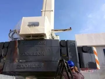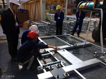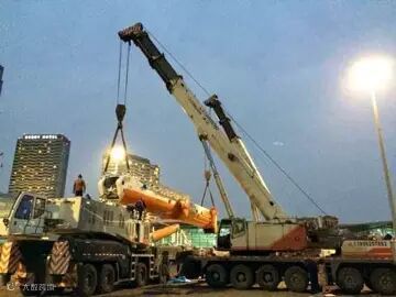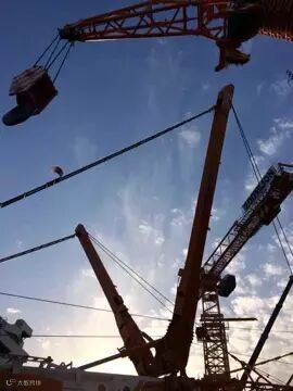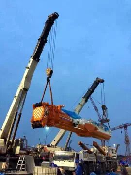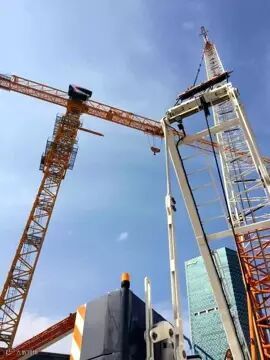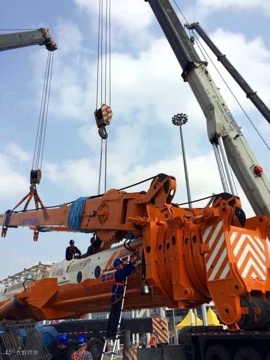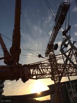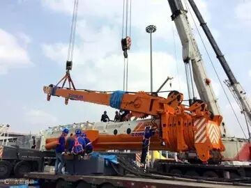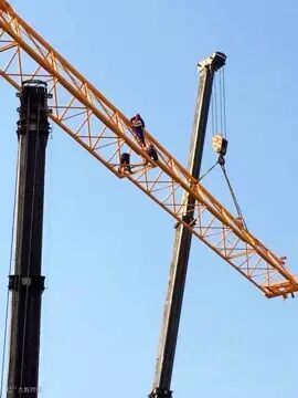 兄弟并肩,汽车吊协助塔机臂架安装。